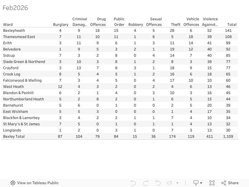Bexley Crime stats ward summary Feb 2026